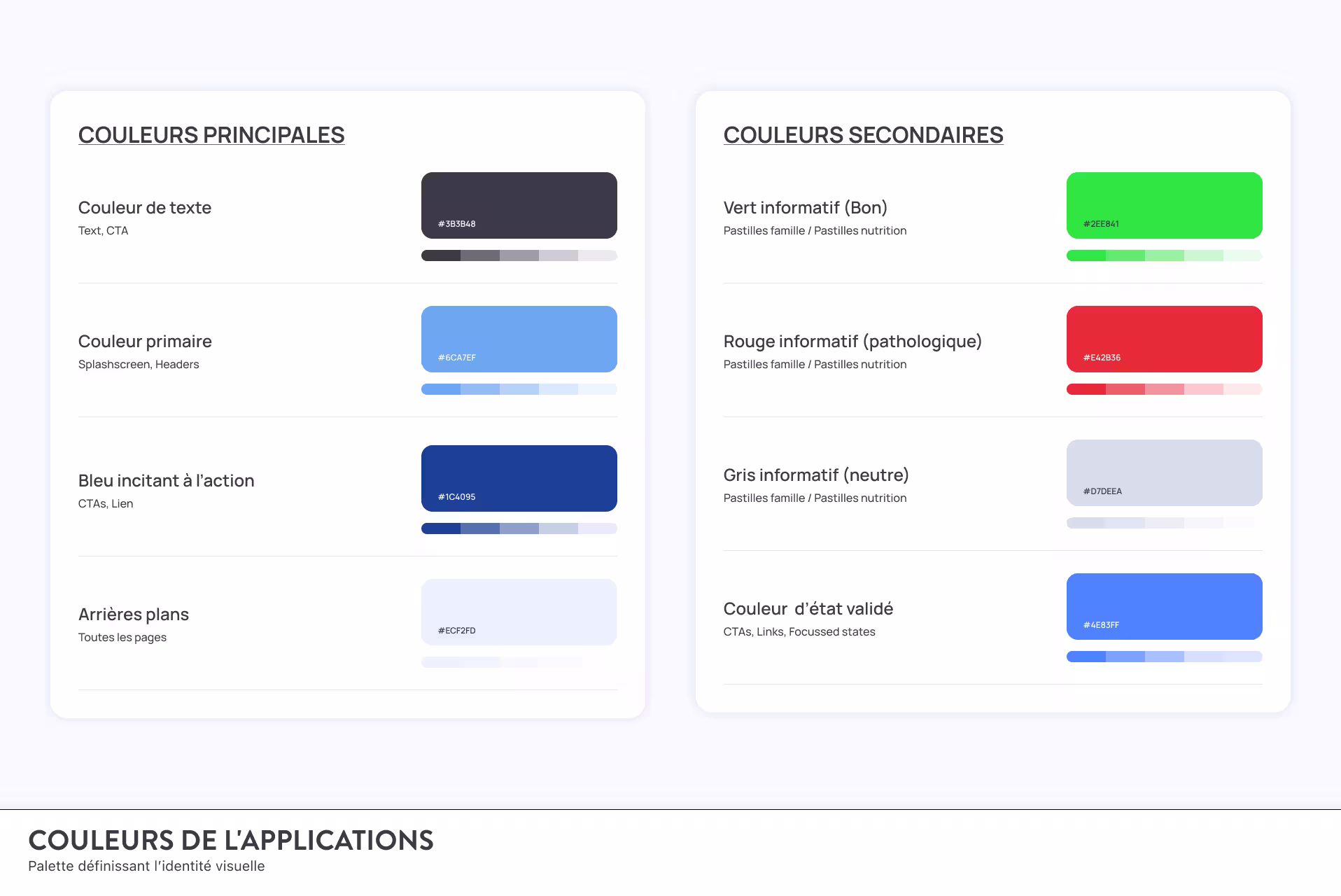 - Couleurs fonctionnelles (bleu : action, vert : bon, rouge : alerte)